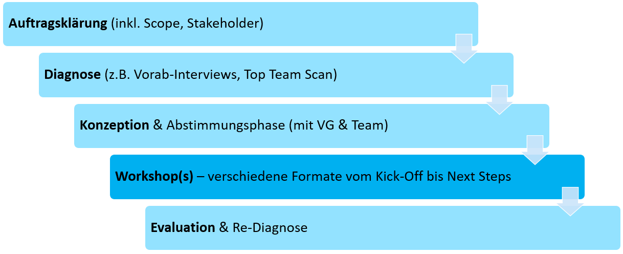 - Um die Herausforderungen und Bedürfnisse Ihres Teams zu verstehen führen wir Interviews und einen Top Team Scan durch. So entwickeln wir passgenaue und ganzheitliche Lösungen.