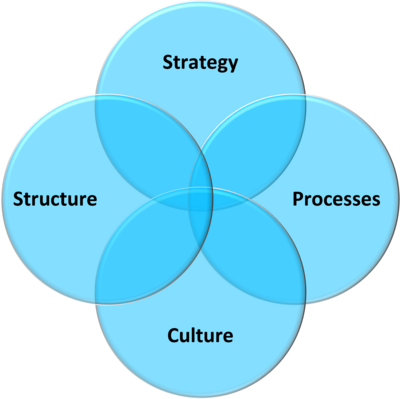 When it comes to organizational development, we consider four key dimensions that only have a lasting impact when they work together in harmony: strategic alignment sets the direction, the right processes enable efficient work, successful structures create clarity about roles and responsibilities, and organizational culture promotes values that encourage a shared understanding and commitment. Our work always takes all four dimensions into account to ensure comprehensive transformation.